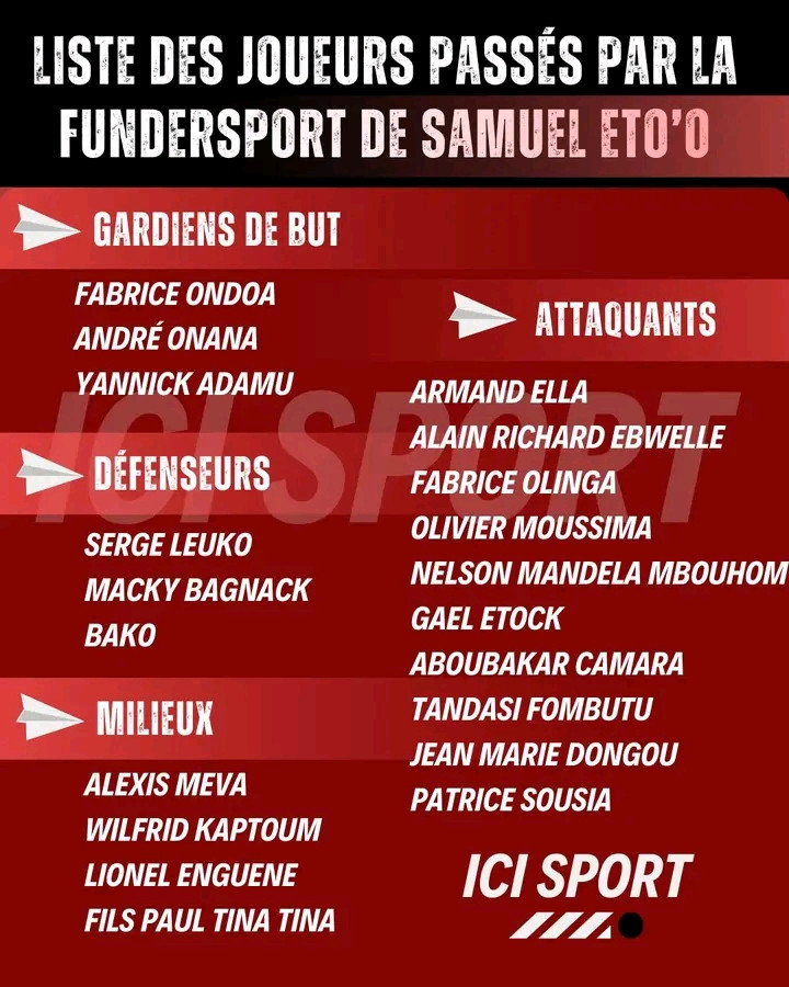 Fondée en 2005 au Cameroun, la Fondation Eto’o Samuel Sport (Fundersport) a encadré de nombreux jeunes qui font aujourd’hui la fierté du football camerounais en l’occurrence André Onana et Fabrice Ondoa. Découvrez ci-dessous la longue liste des joueurs passés par la Fundersport.