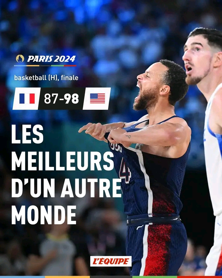 #Joparis2024 🔴 La Dream Team USA🇺🇸 avec Stephen Curry, Lebron James et Kevin Durant remporte la médaille d’Or au Basket en battant en finale la France🇫🇷 sur le score 98 à 87 !
