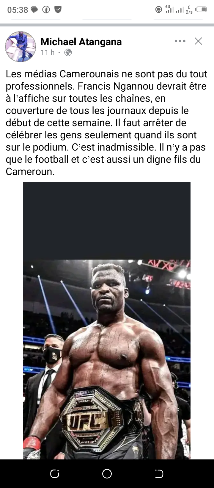 ''Les médias Camerounais ne sont pas du tout professionnels. Francis Ngannou devrait être à l’affiche sur toutes les chaînes, en couverture de tous les journaux depuis le début de cette semaine. Il faut arrêter de célébrer les gens seulement quand ils sont sur le podium. C’est inadmissible. Il n’y a pas que le football et c’est aussi un digne fils du Cameroun.'' 🇨🇲