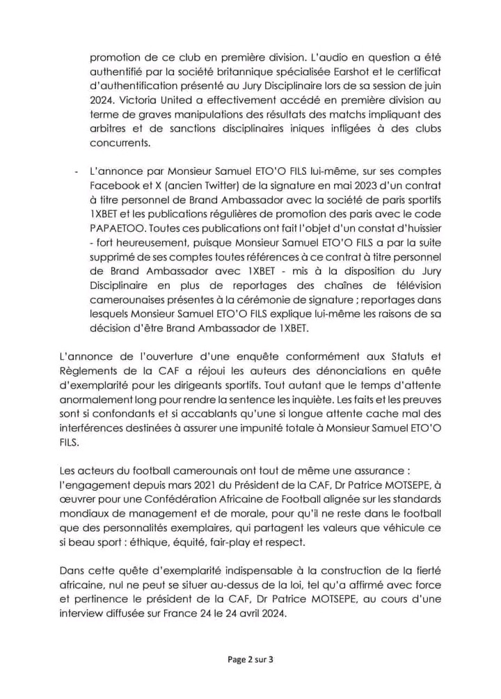 📝 Les plaignants demandent la suspension d’Eto’o du comité exécutif de la CAF et l’ouverture d’une procédure éthique à la FIFA.