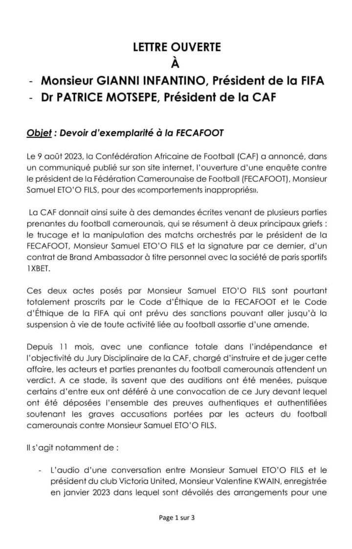 🔴 La correspondance adressée par le général Pierre ****** gue, Faustin Domkeu, Henri Mballa, Guibaï Gatama, Safia kwemo, Joseph Feutcheu, Max Kome et François Kouedem au président de la FIFA et celui de la CAF pour exiger que le président de la #Fecafoot (Samuel Eto'o) soit corrigé.