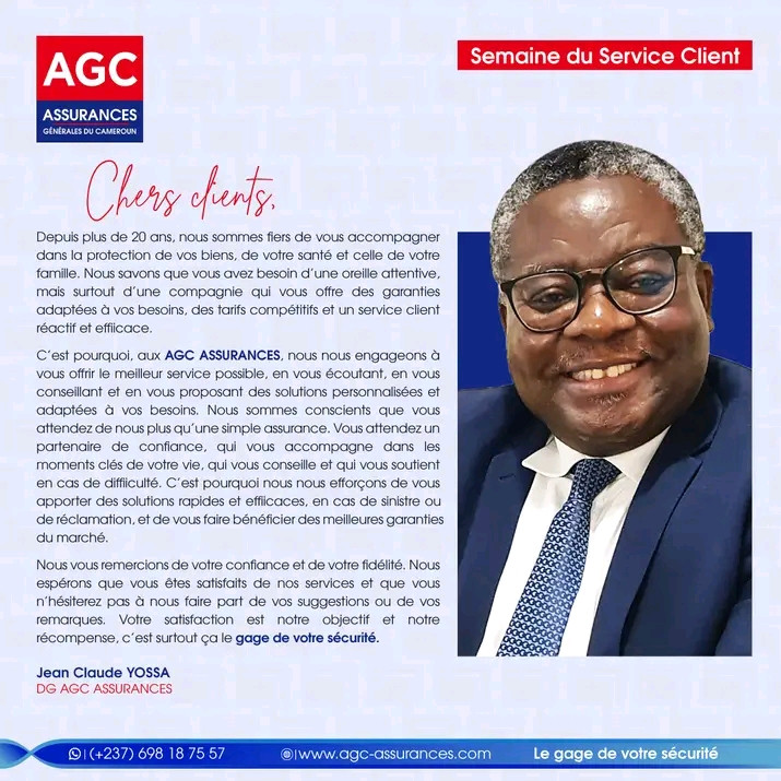 Chers clients, c'est avec beaucoup de joie et gratitude que notre Directeur Général, Monsieur Jean Claude Yossa, vous adresse ces quelques mots afin de vous dire MERCI pour votre confiance et votre fidélité. Nous espérons que vous êtes satisfait de nos services et que vous n’hésiterez pas à nous faire part de vos suggestions ou de vos remarques. Votre satisfaction est notre objectif et notre récompense, c’est surtout ça le gage de votre sécurité.