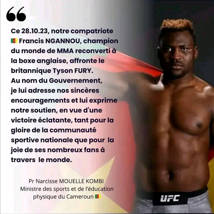 Le Ministre des Sports et de l'Éducation Physique 🇨🇲 le Pr Narcisse Mouelle Kombi adresse ses sincères encouragements et son soutien à Francis N'Gannou 🥊