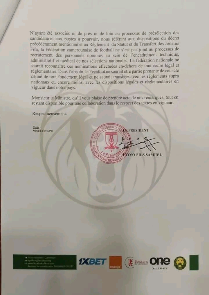 “The Minister of Sports and Physical Education wishes to reassure the sporting public that the Indomitable Lions are calmly continuing their preparation following the program set by the Coach-Selector, Mr. Marc BRYS, with the logistical means, equipment and materials diligently made available to them by the State.”