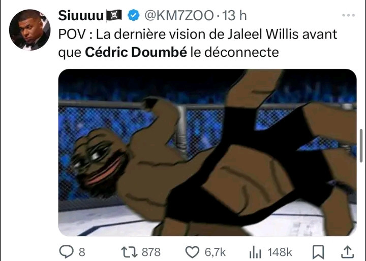 #Peupah_Zouzoua👨🏽💻 Et Willis a alors bien consommé la patate avec ouaricot et sans eau, Dieu seul sait le cardio que cela nécessite 😭😭🙌🏽🙌🏽 Doumbè s'est donc imposé au premier round par TKO face à Jaleel Willis, au Bellator Paris ! 🔥💪🏽🇫🇷🇨🇲 Adieu l’épine de baki, bonjour la patate de Willis🥳🥳🥳👏🏽👏🏽👏🏽 Tegue interdit, l’envol sera puissant🚶🏾🚶🏾🚶🏾🦇🦇🦇