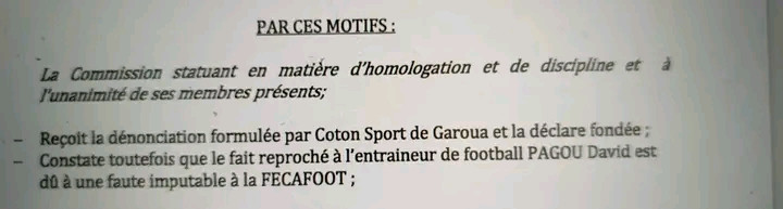 Dans l'affaire Coton sport de Garoua contre Pagou David, l'entraîneur de Stade renard de Melong. La commission donne raison à Coton sport mais, estime que Coton sport ne peut gagner des points parce que " le fait reproché à l’entraîneur Pagou est dû à une faute imputable à la Fecafoot"