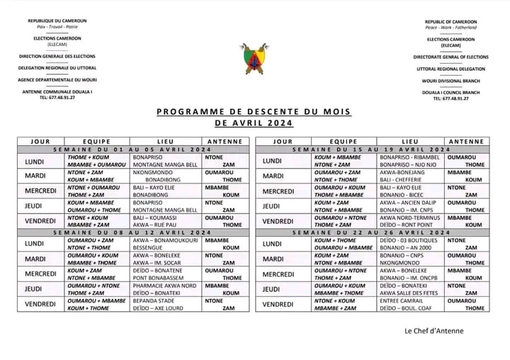 #election2025 🗳️ Les gens de Douala premier, voici le programme des Descentes pendant les jours ouvrables du mois d'avril