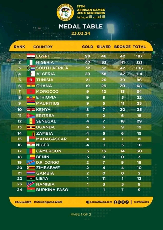 voici le classement final des medailles lors des jeux africains au Ghana. Bilan mitigé pour le Cameroun qui lors de la dernière édition avec eu 22 médailles au Maroc pour 5 en or. Seulement cette fois il y'a certes plus de médailles 30 au total pour seulement 3 en or. 🏆
