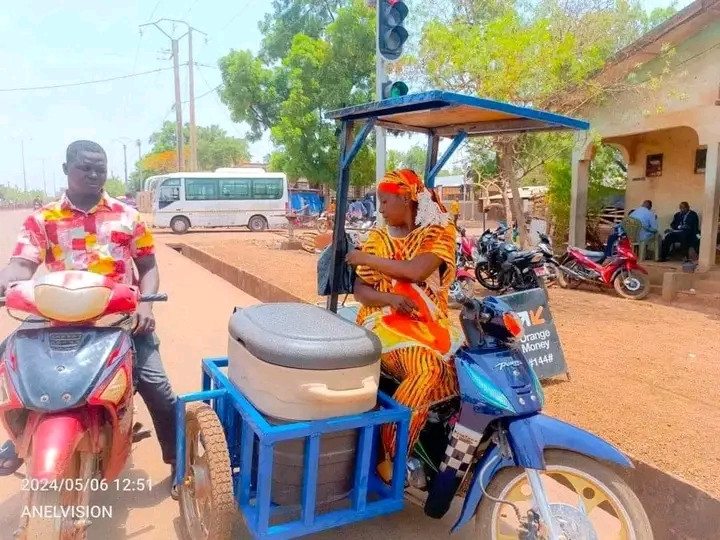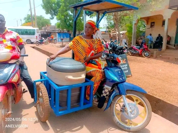 Cette femme vit en Guinée et elle a transformée sa moto en tricycle pour vendre ses jus et des produit naturels dans la ville de Siguiri.