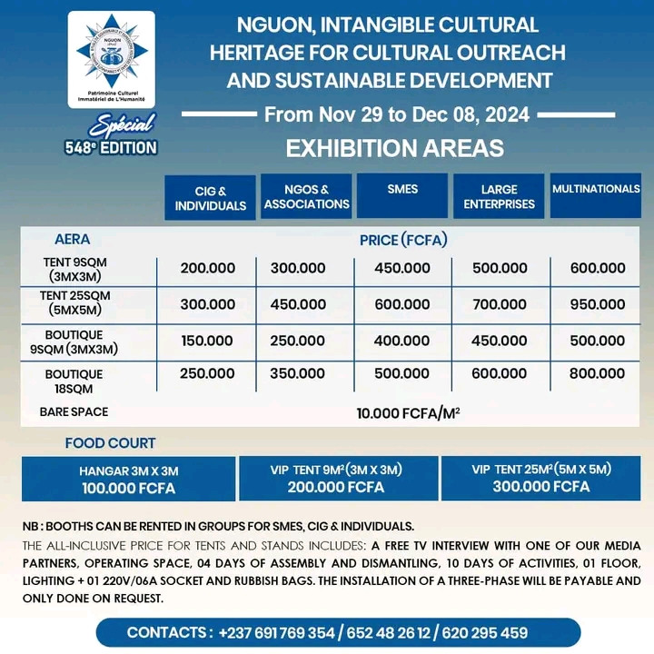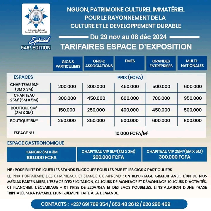 Avec plus de 𝟓𝟎𝟎 𝟎𝟎𝟎 𝐟𝐞𝐬𝐭𝐢𝐯𝐚𝐥𝐢𝐞𝐫𝐬 attendus, le 𝐍𝐠𝐮𝐨𝐧 est le rendez-vous culturel par excellence pour donner à votre activité une visibilité considérable. Alors 𝐯𝐞𝐧𝐞𝐳 𝐚𝐮𝐬𝐬𝐢 𝐩𝐫𝐞𝐧𝐝𝐫𝐞 𝐯𝐨𝐬 𝐬𝐭𝐚𝐧𝐝𝐬 et vivez le Nguon en faisant de bonnes affaires.