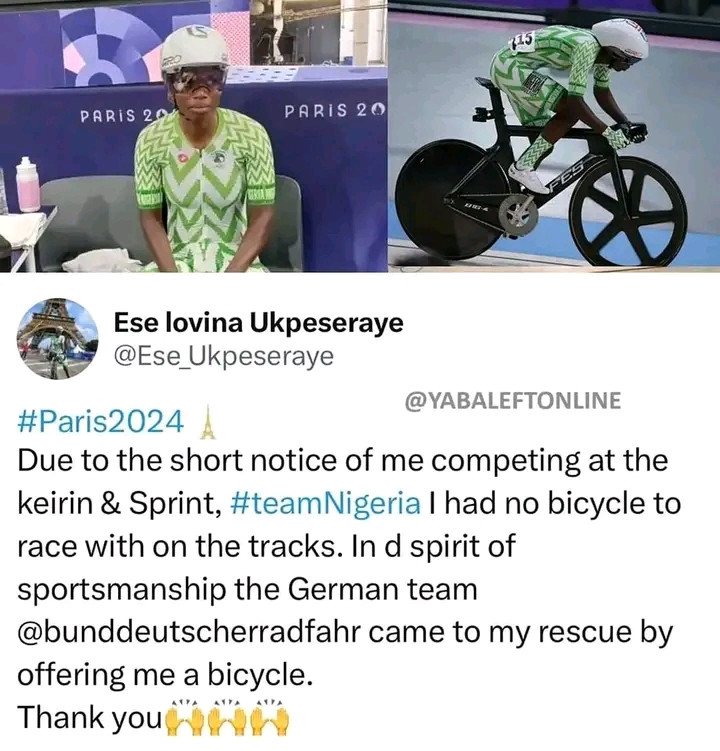 ♦️ Jeux Olympiques: La cycliste nigériane, Ese Ukpeseraye, remercie l’équipe allemande de lui avoir prêté un vélo pour concourir, car son pays le Nigeria qu’elle représentait n’en avait pas fourni.
