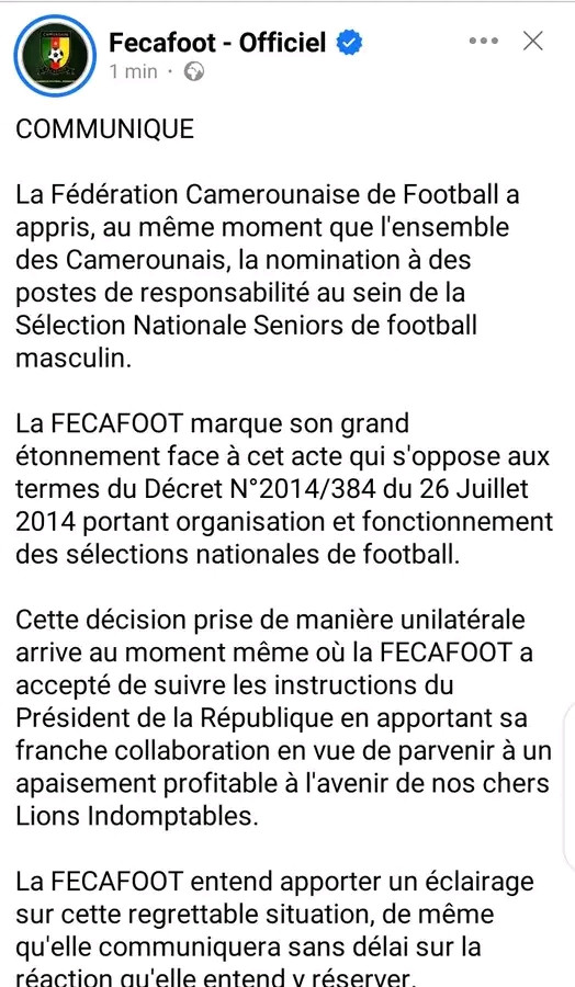 La fecafoot ne reconnaît pas pour l'instant le staff technique du Ministre des sports ?