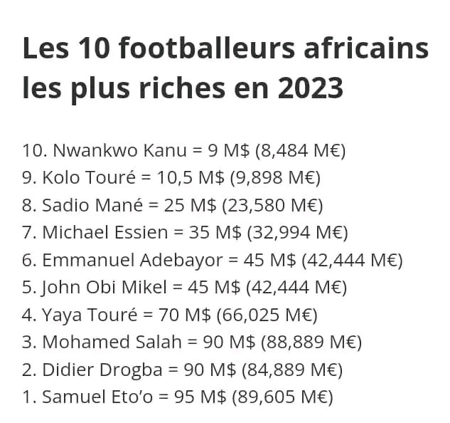Samuel Eto'o indéboulonable en tête du classement des footballeurs africains les plus fortunés en 2023. Le salaire peut être un excellent point de départ pour le développement d'un homme et c'est ce que Samuel Eto'o a su faire avec énormément de placements, notamment dans le secteur de l'immobilier. Ses actifs en nature en 2023 se chiffrent donc à plus de 100millions de dollars. Cette somme colossale n'intègre pas le cash money des banques avec ces derniers immenses contrats d'ambassadeur de la coupe du monde au Qatar, Ethipian Airlines, Turquish Airlines, UBA, etc...