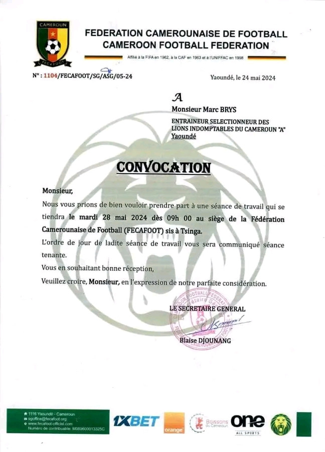« Nous vous prions de bien vouloir prendre part à une séance de travail qui se tiendra le mardi 28 mai 2024 dès 09h00 au siège de la Fédération Camerounaise de Football (FECAFOOT) sis à Tsinga.