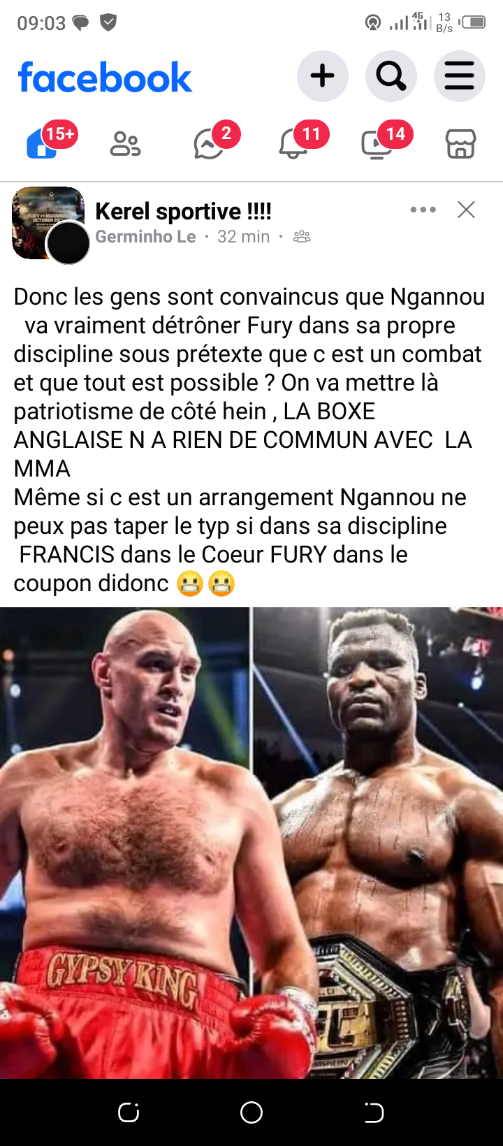 ''Donc les gens sont convaincus que Ngannou va vraiment détrôner Fury dans sa propre discipline sous prétexte que c est un combat et que tout est possible ? On va mettre là patriotisme de côté hein , LA BOXE ANGLAISE N A RIEN DE COMMUN AVEC LA MMA