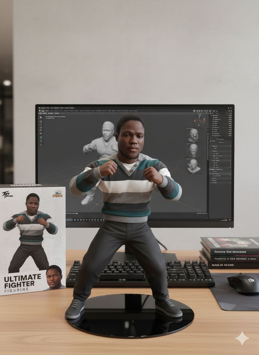 "A hyper-realistic 3D-rendered collectible figurine of me in the my Tshirt, standing like manga. The figurine is placed on a desk in front of a computer displaying the digital 3D sculpting process of me in Blender. A branded product box featuring my image and artwork is also on the desk. Highly detailed textures, lifelike proportions, dynamic pose, and realistic lighting. Studio-quality photography with sharp focus, reflections on the glass base, and soft ambient light illuminating the workspace. Background includes a modern keyboard, mouse, books, and monitor, emphasizing the creative process of digital to physical 3D modeling."